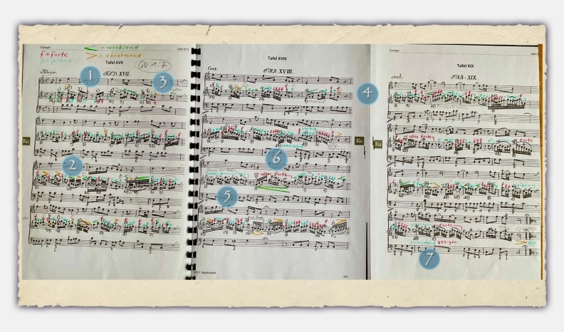 In order to have an immediate visual overview, I have marked each of these corresponding dynamic signs in the musical text with a different colour, according to Quantz's specifications.