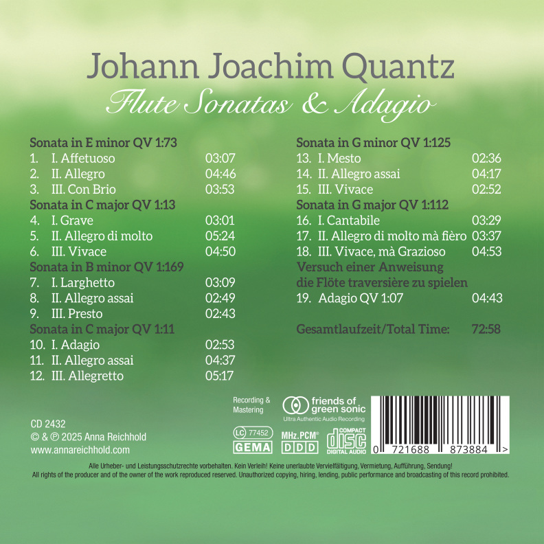 For these recordings, Anna Reichhold played a meticulously reconstructed replica of a traverso flute designed by Quantz, employing authentic Baroque performance techniques, including historically accurate articulations and ornamentation.